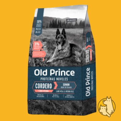 Alimento balanceado para perros adultos mayores marca Old Prince línea novels de la empresa Baires. Bolsas de 15 y 3 kgs con 31% de proteinas. Sabor cordero y arroz