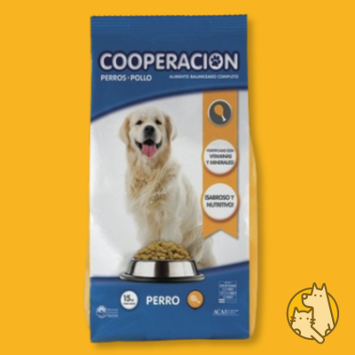 Alimento balanceado para perros adultos de la marca Cooperación. Presentación de 15 kgs con 24% de proteinas. Sabor pollo