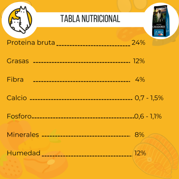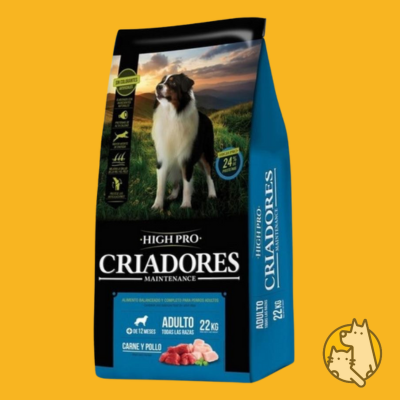 Alimento balanceado para perros adultos marca Criadores de la empresa Baires. Presentación de 22 kgs con 24% de proteinas. Sabor carne y pollo