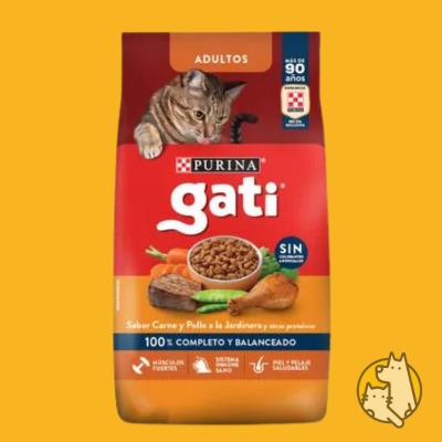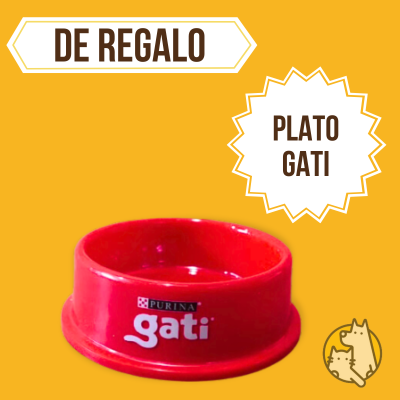 Alimento balanceado para gatos adultos Gati de la empresa Purina. Presentación de 15 kgs con 26% de proteinas. Sabor carne y pollo. Incluye plato de regalo de Gati
