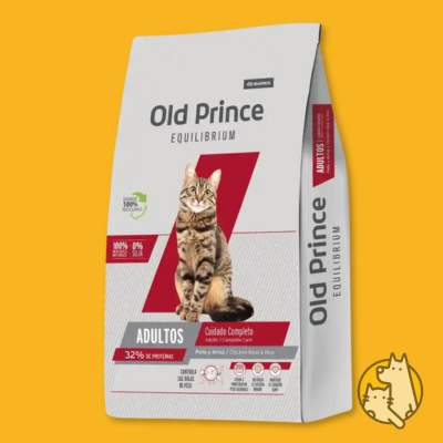 Alimento balanceado para gatos adultos marca Old Prince línea equilibrium de la empresa Baires. Bolsas de 7,5 kgs con 32% de proteinas. Sabor pollo y arroz