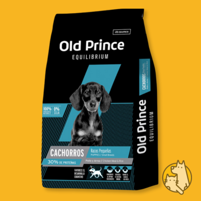 Alimento balanceado para perros cachorros raza pequeña marca Old Prince línea equilibrium de la empresa Baires. Bolsas de 7,5 kgs con 30% de proteinas. Sabor pollo y arroz