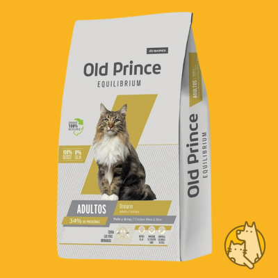 Alimento balanceado para gatos con dieta prescripta por problemas urinarios marca Old Prince línea equilibrium de la empresa Baires. Bolsas de 7,5 kgs con 34% de proteinas. Sabor pollo y arroz